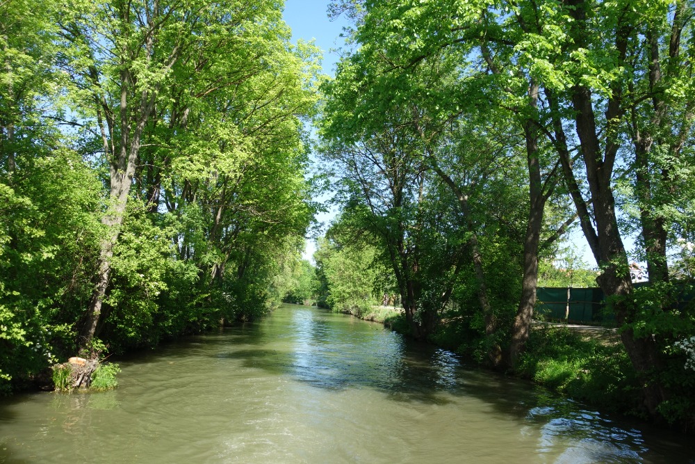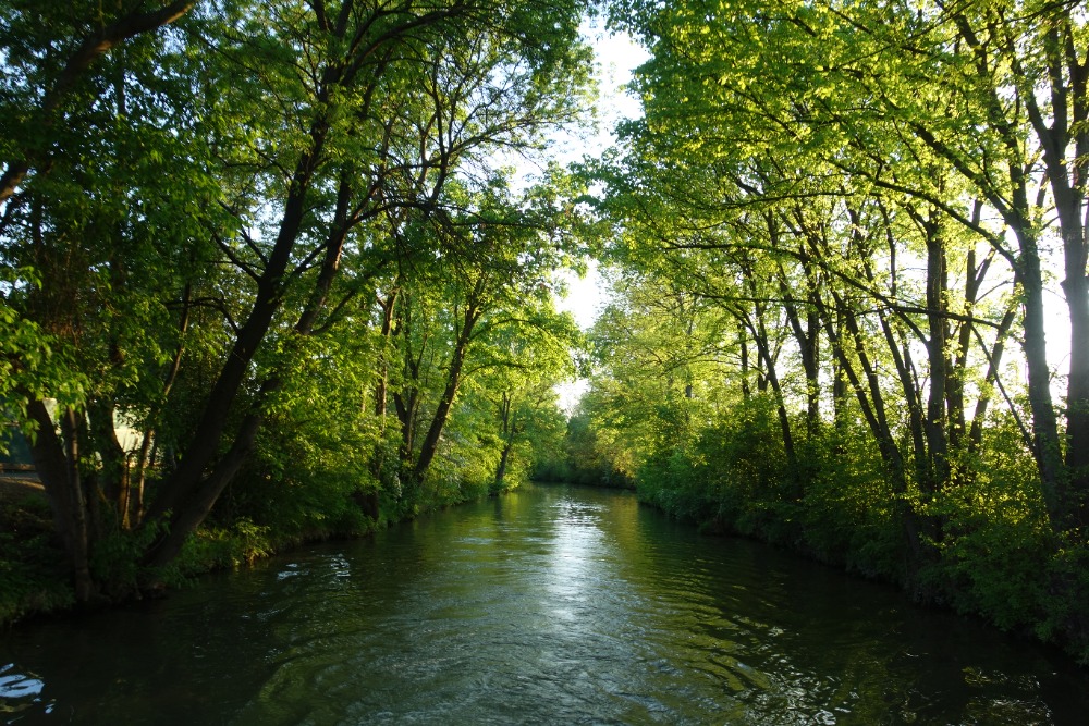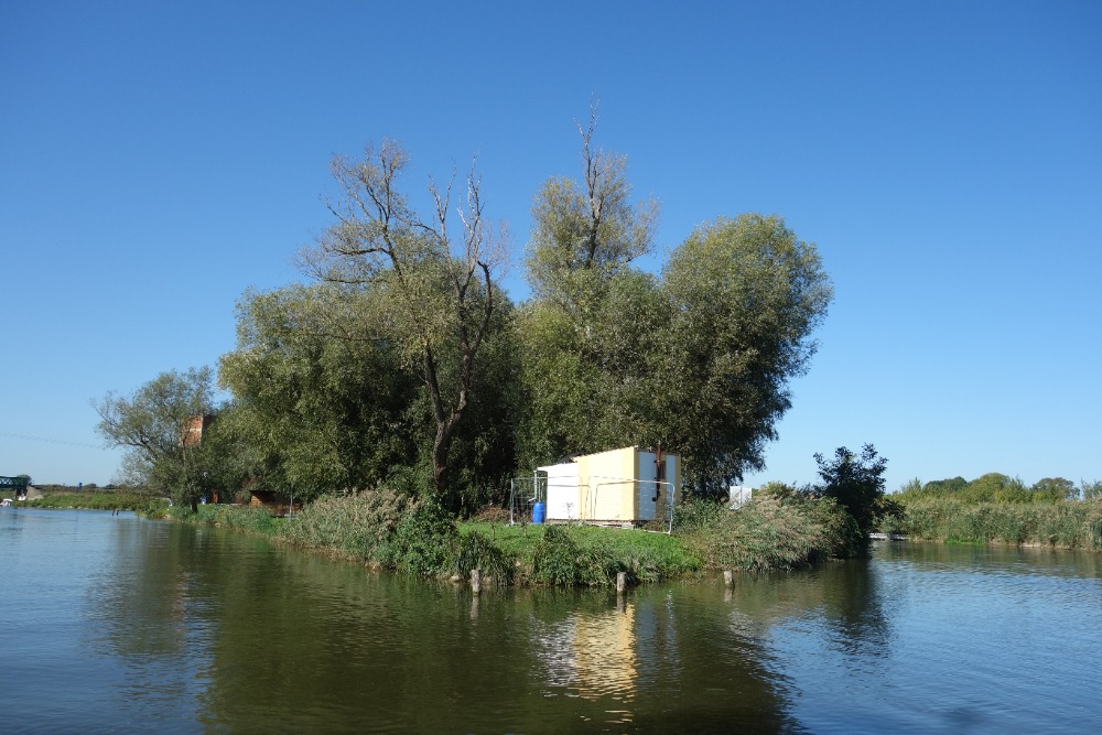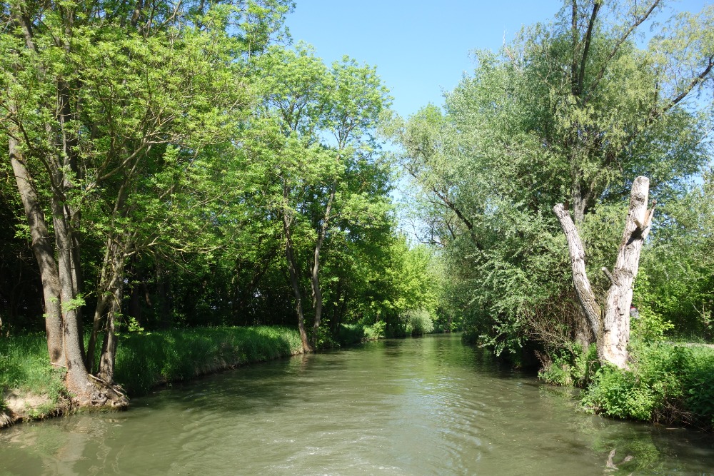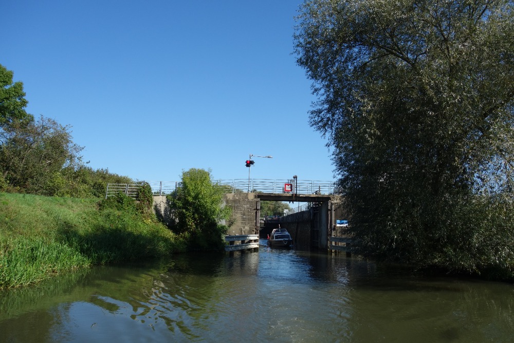 Za křížením pokračujeme velmi úzkým jednolodním kanálem. Při rekonstrukci kanálu byly břehy zpevněny lomovým kamenem. V současnosti jsou břehy již zarostlé vegetací, která vytváří z této části Baťova kanálu jeden z nejhezčích úseků.