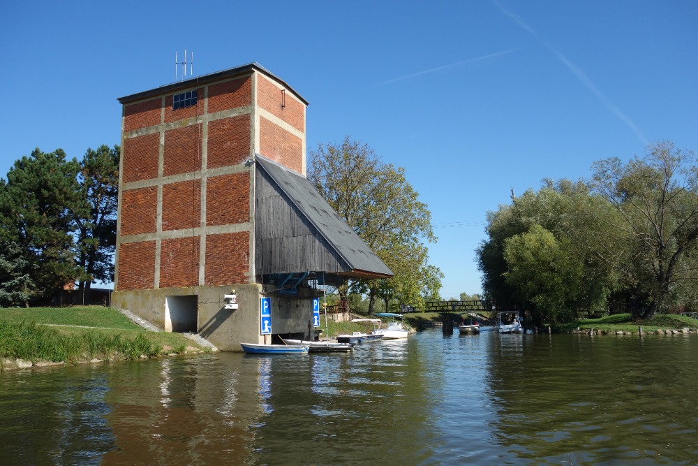 Za zámeckým parkem proplujeme přes křížení Baťova kanálu a říčky Veličky. Křížení tvoří dvě plavební komory, které oddělují Baťův kanál od říčky Veličky. Plavební komory jsou otevřené z obou stran, výšku hadiny v říčce Veličce udržuje automatický jez. Více informací o tomto zajímavém vodním díle naleznete zde.