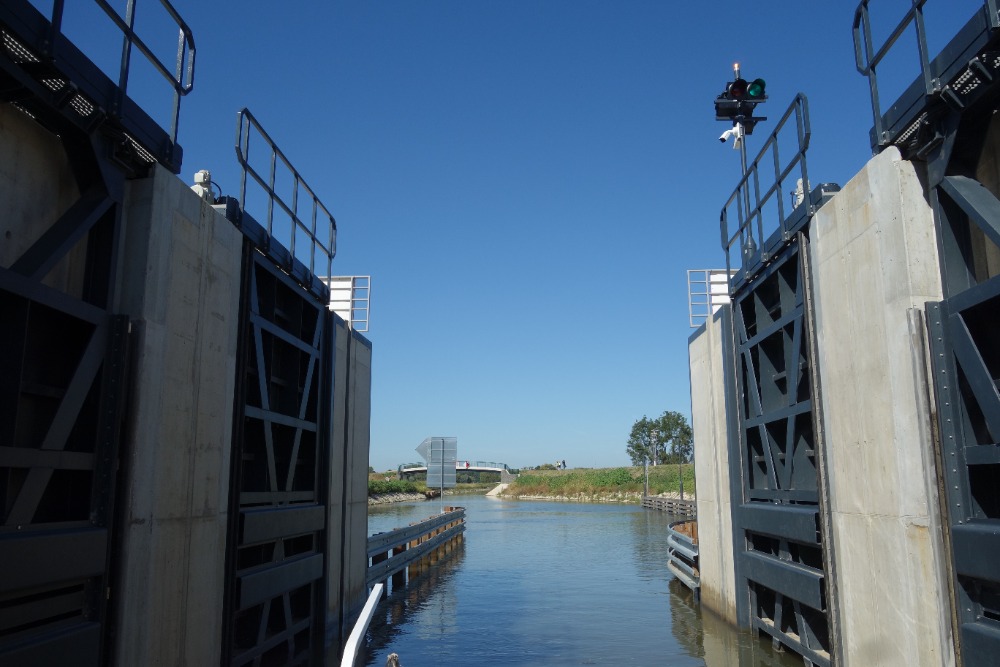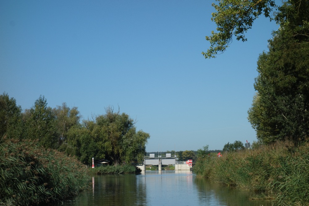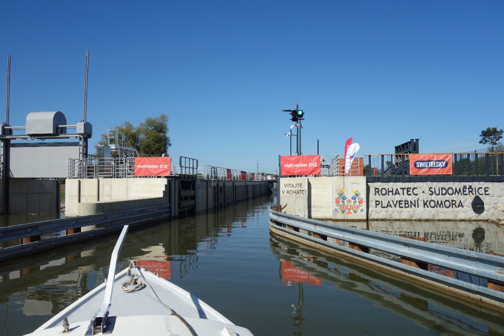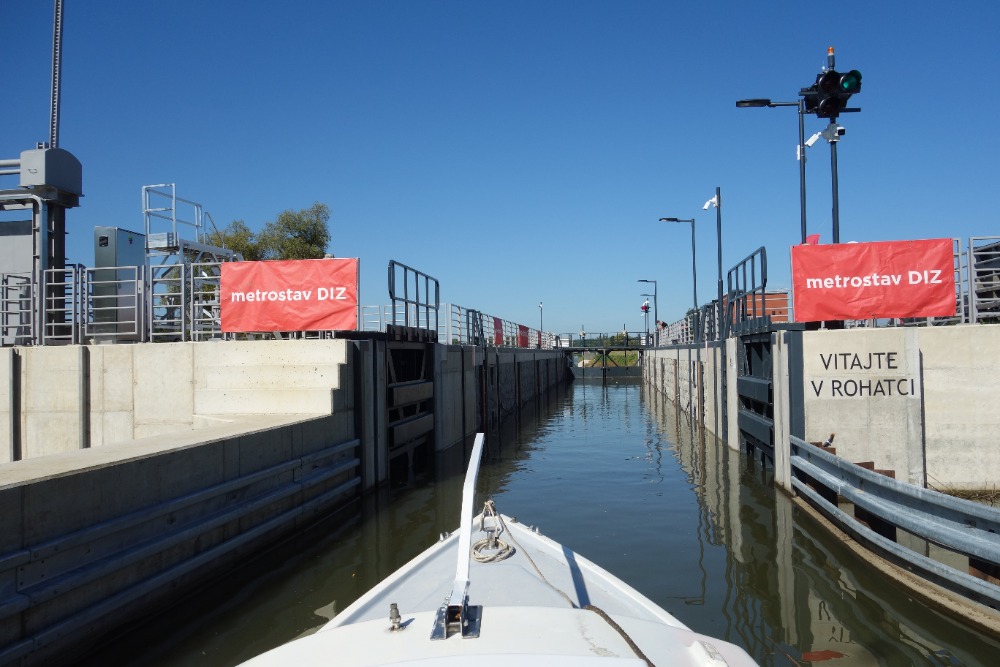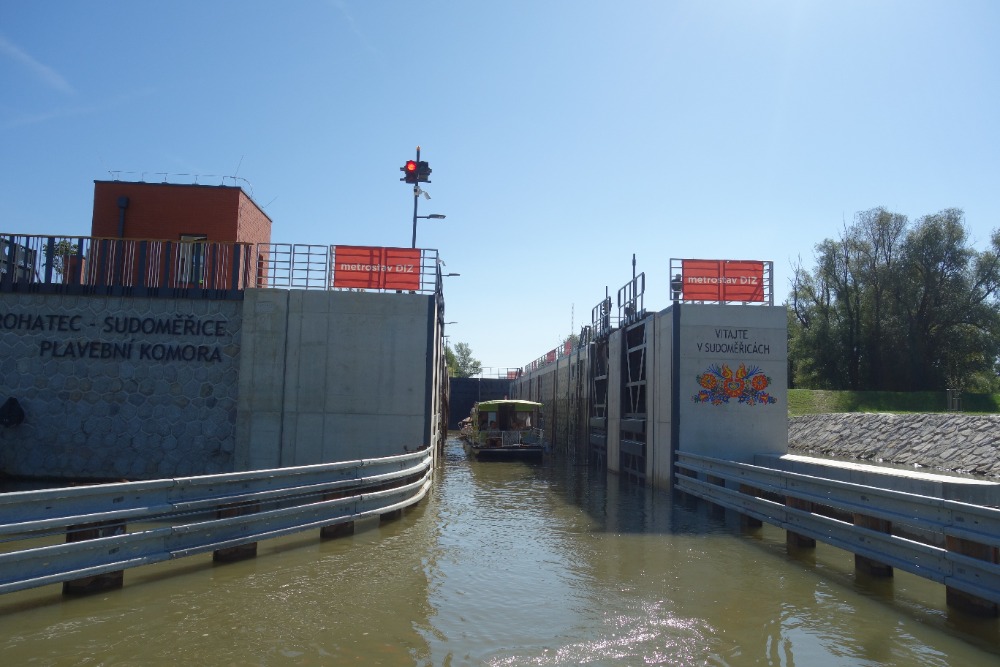 Proplavíme se přes novou plavební komoru Rohatec. Komora má spád 2,5m a byla uvedena do provozu v roce 2026. Pod komorou proplujeme úzkým, 650 m dlouhým spojovacím kanálem do řeky Moravy. Po řece Moravě poplujeme cca 700m.