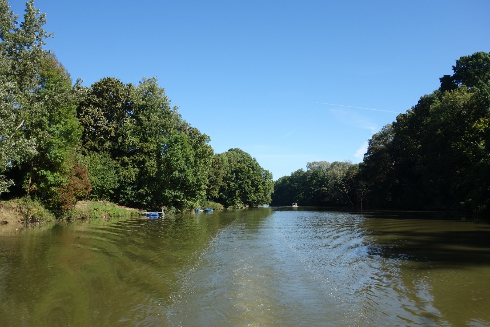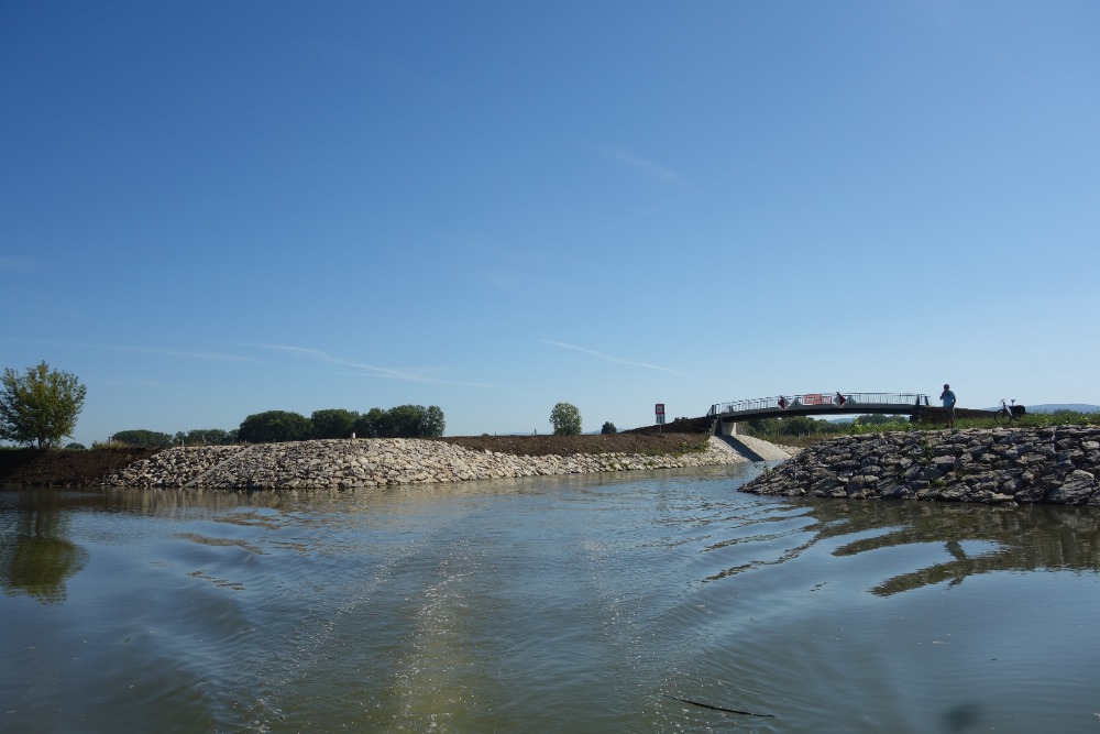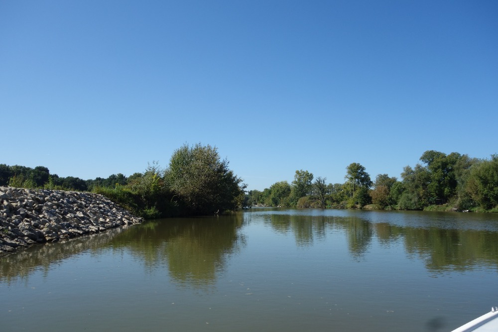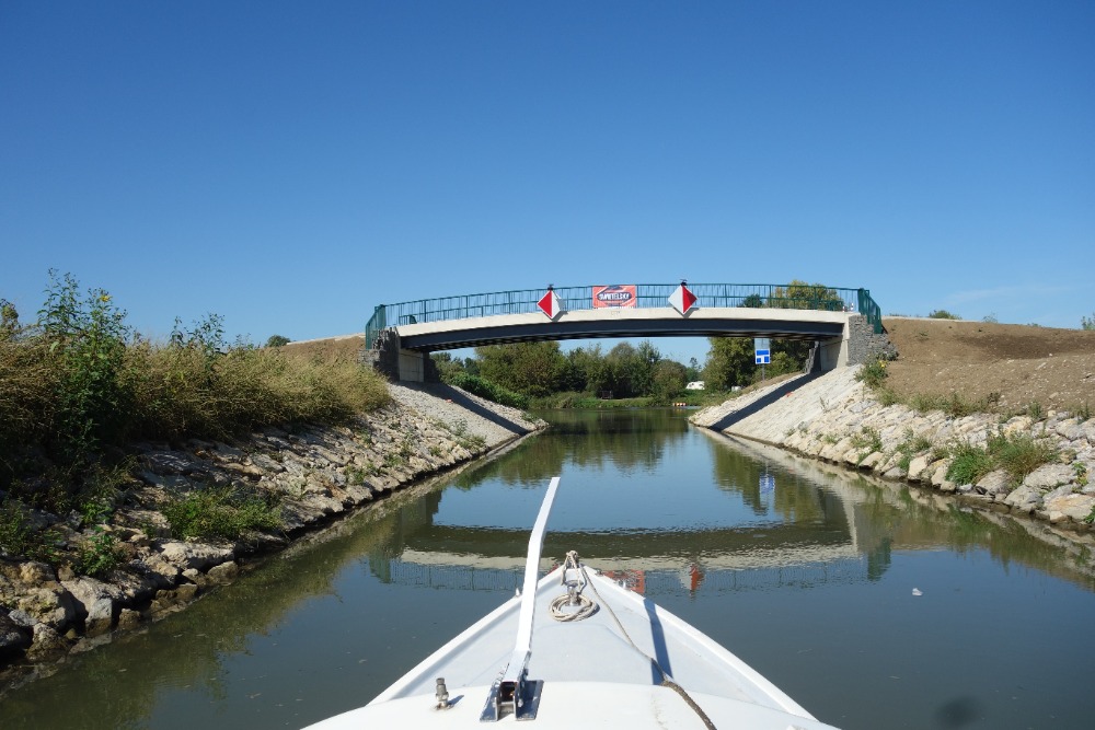 Proplavíme se přes novou plavební komoru Rohatec. Komora má spád 2,5m a byla uvedena do provozu v roce 2026. Pod komorou proplujeme úzkým, 650 m dlouhým spojovacím kanálem do řeky Moravy. Po Moravě pokračujeme proti proudu cca 1500m před železniční most.